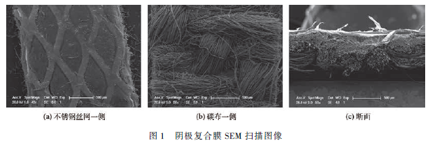 導(dǎo)電復(fù)合膜元件主要由電極、集流體和分隔層構(gòu)成。電極材料為石墨布(ED-05-130,荊州浩特新材料有限公司),其面積密度為180 g·m - 2 ,體積電阻率0. 05 Ω·cm,比表面積1 154 m2 ·g - 1 (BET),厚度(0. 397 ± 0. 009)mm;陰極集流體(指電流集流體)材料為不銹鋼絲網(wǎng),孔徑43 μm,厚度(0. 080 ± 0. 001)mm;陽極集流體材料為鈦網(wǎng),厚度(0. 109 ± 0. 003)mm;分隔層材料為尼龍網(wǎng),厚度(0. 083 ± 0. 004)mm;陰極集流體和電極通過聚偏氟乙烯(PVDF)粘結(jié)成陰極復(fù)合膜元件,陽極集流體和電極組成陽極復(fù)合膜元件。陰極復(fù)合膜元件的表面形貌和斷面結(jié)構(gòu)見圖1。