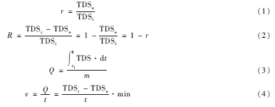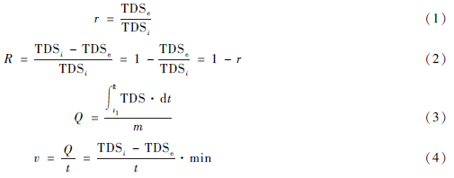 式中:TDSi 為進(jìn)水的總?cè)芙庑怨腆w,TDSe 為出水的總?cè)芙庑怨腆w,TDSe·min 為出水最低總?cè)芙庑怨腆w,r 為相對出水TDS,即出水TDS 與進(jìn)水TDS 的比值(以百分比表示),R 為TDS 去除率,Q 為單位電極對TDS 的吸附量,v 為最大吸附速率,t1 為運(yùn)行開始時(shí)刻,t2 為運(yùn)行結(jié)束時(shí)刻,t 為運(yùn)行時(shí)間,m 為電極質(zhì)量。