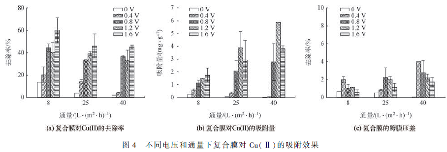 2) 在外加電壓0 ~ 1. 6 V、膜通量8 ~ 40 L·(m2 ·h) - 1 的條件下,膜通量相同時(shí),電壓越大,復(fù)合膜對Cu(Ⅱ)的去除率和吸附容量越大;外加電壓相同時(shí),膜通量越大,復(fù)合膜對Cu(Ⅱ)的去除率越小,吸附量越大;Cu(Ⅱ)濃度5 ~ 40 mg·L - 1 的條件下,Cu(Ⅱ)濃度越大,復(fù)合膜對Cu(Ⅱ)的去除率越小,吸附量和最大吸附速率越大。