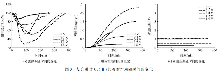 以Cu(Ⅱ)濃度為10 mg·L - 1 ,通量為8 L·(m2 ·h) - 1 為例,探索不同電壓下導(dǎo)電復(fù)合膜對Cu(Ⅱ)的吸附作用隨時(shí)間的變化,結(jié)果如圖3 所示。