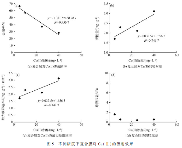由圖5(a) ~ (c)可知,進(jìn)水Cu(Ⅱ)濃度與去除率、吸附量和最大吸附速率都呈現(xiàn)良好的線性關(guān)系。在電壓1. 6 V、通量8 L·m - 2 ·h - 1 的條件下,復(fù)合膜對Cu(Ⅱ)的去除率隨著Cu(Ⅱ)濃度的升高而減小,本研究中Cu(Ⅱ)濃度為5 mg·L - 1 時(shí)去除率最大;吸附量和最大吸附速率隨著Cu(Ⅱ)濃度的升高而增大,當(dāng)Cu(Ⅱ)濃度為40 mg·L - 1 時(shí)吸附量和最大吸附速率最大。說明進(jìn)水溶液中重金屬離子的濃度會(huì)影響吸附材料對離子的去除率和吸附量。安眾一等利用粉末活性炭電極對銅離子進(jìn)行電吸附研究,選取1. 2 V 電壓,銅離子濃度分別為50、100、150、200 和500 mg·L - 1 。結(jié)果表明,濃度為50 mg·L - 1時(shí)的銅離子去除率最大,但吸附量最小。說明低濃度時(shí)電極的吸附容量遠(yuǎn)遠(yuǎn)未達(dá)飽和狀態(tài),所以去除率高,但過高濃度的離子會(huì)使電極吸附飽和,因而去除率降低,但吸附量和最大吸附速率增大。由圖4(d)可知,跨膜壓差與Cu(Ⅱ)濃度無明顯線性關(guān)系,但總體跨膜壓差維持在較低水平,均低于2 kPa。