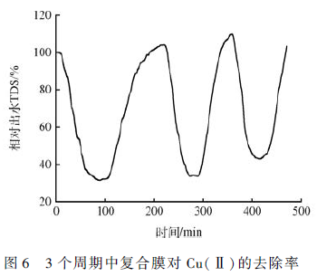 選擇Cu(Ⅱ)濃度為10 mg·L - 1 ,通量8 L·(m2 ·h) - 1 ,電壓1. 6 V,探索本工藝在“吸附-解吸”循環(huán)中的性能,結(jié)果如圖6 所示。由圖6 可知,運(yùn)行3 個(gè)完整“吸附-解吸”周期,系統(tǒng)平均TDS 去除率為60% ,吸附和解吸的平均時(shí)間分別為71 和86 min。與單次吸附實(shí)驗(yàn)結(jié)果(見圖3(a)和4(a))相比,其TDS 平均去除率無明顯差別,表明本工藝在3 個(gè)循環(huán)周期中“吸附-解吸”性能良好。李少華等 利用活性炭纖維電極進(jìn)行電容去離子脫鹽實(shí)驗(yàn)中,采用短接再生法也得到了類似結(jié)論,但是其研究中極板是平行布置的形式,且未與膜分離技術(shù)相結(jié)合。具體參見污水寶商城資料或http://m.bnynw.com更多相關(guān)技術(shù)文檔。