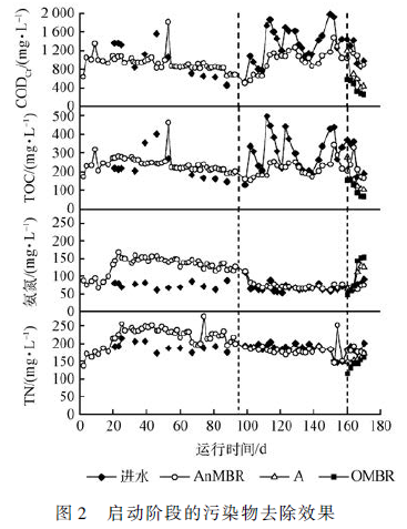 AnMBR/ A/ OMBR 系統分兩步進行啟動,首先啟動運行AnMBR,AnMBR 在間歇進水、絕對厭氧的條件下進行厭氧污泥馴化,95 d 開始連續進水運行,160 d 開始啟動整套系統。從馴化階段開始污染物的去除效果如圖2 所示。