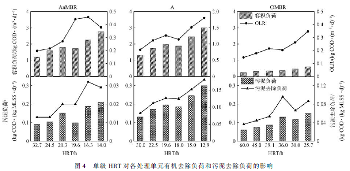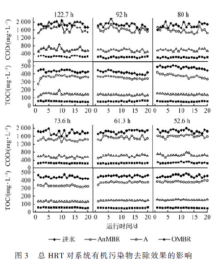 HRT 是廢水處理系統最重要的設計和運行參數,直接影響污泥微生物降解污染物的效果,一定程度上延長HRT 可以提高污染物的降解率。但適當縮短HRT 能夠充分利用污泥的微生物生物活性,提高其有機負荷和污泥去除負荷。在保證系統處理效率的前提下,綜合考慮有機污染物的去除效果,同時使An-MBR 單級去除負荷達到最大,確定處理系統總HRT 為61. 3 h,AnMBR、A、OMBR 各處理單元的單級HRT分別為16. 3、15 和30 h。