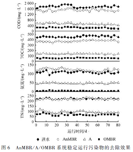 AnMBR、A 和OMBR 中的溶解氧(DO)濃度分別控制在0. 01 ~ 0. 2、0. 1 ~ 0. 5 和4. 0 ~ 6. 0 mg·L - 1 ,除AnMBR(溫度恒定37 ℃ 左右)其余反應器均在室溫(25 ~ 33 ℃ )下運行。OMBR 的pH 由Na2 CO3 溶液調節控制。該系統以不排泥的方式運行,僅在膜清洗時有少量污泥流失。膜污染是膜生物反應器運行中需要關注的重要問題,但本研究重點關注系統的運行效果,不把膜污染作為研究重點。實驗過程中膜污染形成后,根據污染情況不定期采用在線清洗、離線自來水清洗和離線化學清洗(10% NaClO 溶液清洗)3 種方式進行膜清洗。所述的在線清洗的頻率為每周一次,離線自來水清洗和化學清洗的頻率為每月一次。