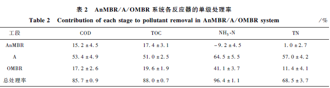 AnMBR/ A/ OMBR 系統各反應器的單級處理率如表2 所示。由于膜對微生物的截留作用,穩定運行期間AnMBR 中活性污泥濃度較高(約為(15. 3 ± 1. 7)g·L - 1 ),對COD 和TOC 的去除率分別達到15% 和17% 。AnMBR 出水NH3 -N 濃度高于進水,說明含氮有機物在AnMBR 中釋放NH3 -N。缺氧反應器對各污染物降解的貢獻最大,去除率均大于50% 。OMBR 對NH3 -N 的去除率最大,達到40% 以上。