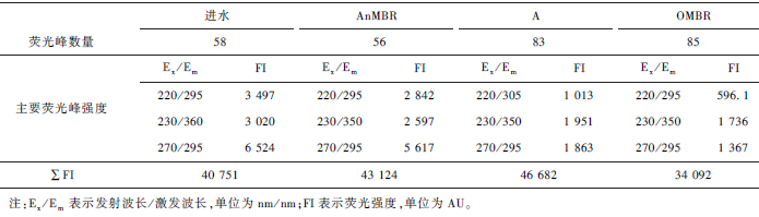 各級出水的熒光峰數量和主要熒光峰的強度變化如表3 所示。由統計結果看出,從進水到AnMBR出水,熒光峰數從58 減少到56,主要熒光峰強度下降15% 左右,與此級的COD 去除率大致相等,而熒光峰熒光強度的總和(ΣFI)增幅較小,可能與此級的COD 降解率較高有關。經過A 和OMBR 處理,OMBR出水的熒光峰數明顯增加但ΣFI 大幅下降,可能與有機污染物經過系統處理后被降解成更多的小分子物質有關。此外,OMBR 出水Ⅰ、Ⅳ區的主要熒光峰強度均大幅下降為進水的17% 和21% ,而Ⅱ區的主要熒光峰強度仍為進水的57. 5% ,是OMBR 出水中強度最高的熒光峰。