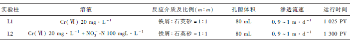 L1 通入20 mg·L - 1 Cr(Ⅵ) 溶液,L2 通入20mg·L - 1 Cr(Ⅵ) + 100 mg·L - 1 NO3- -N 的混合溶液。溶液由柱子的下部輸入上部流出,每隔一定孔隙體積數(PV)從上到下由取樣孔依次取水樣5 ~ 10 mL,過0. 45 μm 濾膜后測溶液的pH 值、Cr(Ⅵ)和NO3- 、NO2- 和NH4+ 濃度。實驗柱子參數見表2。