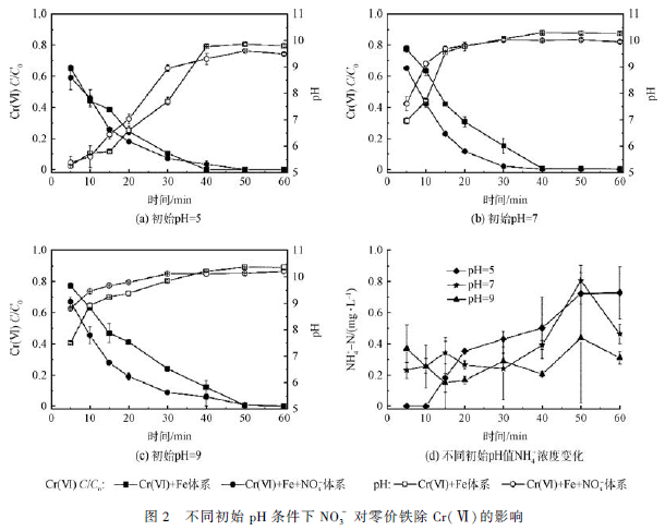 分別設計Cr(Ⅵ) + Fe 反應體系(簡稱CF 體系)和Cr(Ⅵ) + Fe + NO3- (簡稱CFN 體系)2 個反應體系,溶液均為50 mL,背景電解質為0. 01 mol· L - 1 的NaCl,鐵屑量為1 g(20 g·L - 1 ),Cr(Ⅵ) 濃度為10 mg·L - 1 ,NO3- -N 濃度為50 mg·L - 1 ,兩個體系分別在不同的初始pH(5、7、9) 條件下反應,在室溫(24 ± 0. 5)℃ 下,以175 r·min - 1 的速度在搖床進行震蕩,于5、10、15、20、30、40、50 和60 min 時取樣,過0. 45 μm 濾膜,測定pH 值、Cr(Ⅵ)和NO3- 、NO2- 和NH4+ 的濃度。所有實驗均設置2 個平行樣。