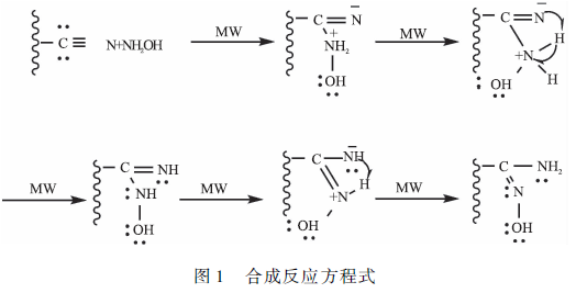 本實驗是在微波加熱的條件下,以PA N纖維為原材料,通過與鹽酸輕胺發(fā)生肪化反應,接枝偕胺肪基團,成功制備出AOPANFmw,并結合其反應機理,得到如圖1所示的合成反應方程式。
