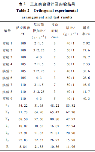 本實驗研究在微波條件下,探究不同反應溫度、反應物投加比(鹽酸輕胺的質量:Na2CO3的質量)、反應時間、浴比(溶液質量:纖維質量)對AOPANFmw的增重率的影響,并采用正交法優(yōu)化制備條件,得出制備改性纖維的最佳條件。實驗使用L9 (3^4)正交表,將反應溫度、反應物投加比、反應時間、浴比作為4個考察因索,并選取各因索中有意義的3個水平進行正交實驗,得到相應正交實驗水平因索表如表1所示,并將具體實驗設計及通過實驗所得的實驗結果列于表2。