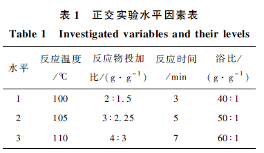 由表2極差分析結果可以得出,4個因素對改性纖維的增重率的影響大小順序是:反應物投加比>浴比>反應時間>反應溫度。4因素中,反應物投加比對纖維的增重率有非常顯著的影響。因此,在正交實驗設計范圍之內,優(yōu)化得到改性纖維制備的最佳條件為:反應溫度105 ℃、反應物投加比4:3、反應時間7 min ,浴比40:1。