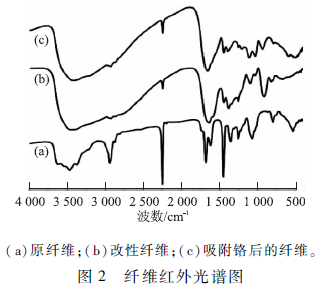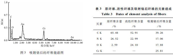 通過EDS測試,得到吸附Cr( Vl)改性纖維的能譜圖見圖3,原纖維、改性纖維及吸附Cr( Vl)纖維的元素組成對比見表3。原PAN纖維的組成元素有C,O,N,對比改性纖維的元素成分,C含量降低,通過肪化反應使氰基變?yōu)橘砂贩净捎诨鶊F變大,其相對分子質量也增大,所以C含量降低。對于N元素,由于改性接枝上氨基,N原子數(shù)量增多,但同時分子整體相對分子質量增加值比N原子質量增加值大,使N含量降低。對于O元素,改性后纖維接枝上輕基,O含量則增加較多。通過測試數(shù)據(jù)所表明的纖維組成元素的變化,可以證明纖維已經成功接枝上偕胺肪基團。而對于吸附鉻之后的改性纖維,觀察到C:元素的峰形明顯,說明纖維已成功實現(xiàn)對鉻的吸附,具有特征吸附性。