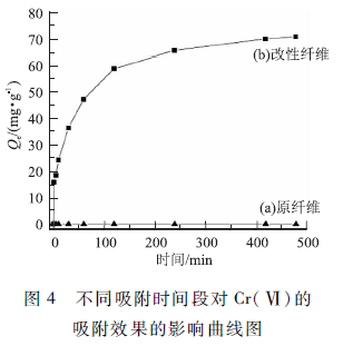 取一定量經過酸處理并干燥好的改性纖維加入50 mL 100 mg / LCr( VI)溶液中,調節(jié)溶液的pH值為5,將其置于水浴恒溫振蕩器中,25℃下充分接觸一定時間,采用二苯碳酞二阱分光光度法測定剩余C r(VI)離子的濃度,并經過計算得出相應吸附容量,將其作為改性纖維吸附能力的判定依據(jù)。該改性纖維對C r(VI)吸附容量的公式見式(2):