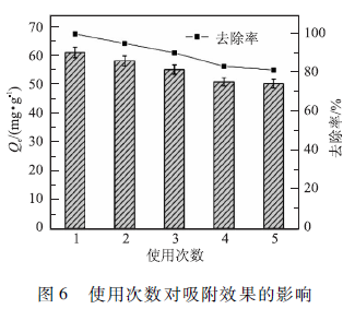 從圖6中可看出,經3次循環(huán)使用后,改性纖維的脫附能力略有下降但變化不大,經過5次吸附后,改性纖維的吸附量仍可以達到第一次吸附量的80%以上,因此從整體來看,使用次數(shù)對改性纖維的吸附能力影響不大,說明再生過程中H2SO4不會對吸附材料的偕胺肪基官能基團產生明顯破壞,AOPANFmw具有良好的化學穩(wěn)定性;另一方面,這也表明制得的AOPANFmw具有可循環(huán)使用的優(yōu)點,在重金屬污染廢水處理領域具有廣闊的應用前景。具體參見污水寶商城資料或http://m.bnynw.com更多相關技術文檔。
