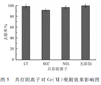 實驗稱取4份0. 100 g酸處理好的纖維,分別加入50mL 100 mg / L Cr( VI)離子溶液中,并取其中的3組按陰離子與Cr()離子的摩爾比為1:1分別投加Cl- ,SO4^2-和NO3-離子,另一組不加干擾離子。實驗在pH為5,溫度為25℃條件下,吸附7h,進行測定。
