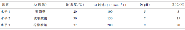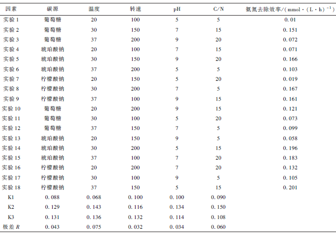 為優化菌株YN3 的脫氮條件,以氨氮為唯一氮源,設計L18 (35 )正交實驗,因素水平表見表1。將菌液以相同接種量接種于裝有100 mL 異養硝化培養基的500 mL 三角瓶中,以氨氮降解效率為反應值分析得到最優培養條件。初始氨氮的質量濃度為70 mg·L - 1 ,依照不同的碳氮比計算碳源質量。