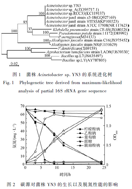 通過BLAST 檢索與GenBank 中的核酸序列進行菌株YN3 16S rDNA 序列的同源性比對,該序列與NCBI 數據庫的Acinetobacter junii (NCBI 登錄號為:KP100 325. 1)同源性達99% ,結合菌株的形態學,確定菌株YN3 屬于不動桿菌屬(Acinetobacter sp. )。使用MEGA 5. 0 核酸分析軟件將菌株YN3 與其他不動桿菌屬和一些異養硝化好氧反硝化細菌進行系統發育分析,得到菌株的系統進化樹(見圖1),由圖1 可以看出,菌株YN3 與不動桿菌親緣關系較近。