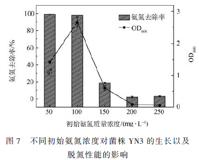 將菌株YN3 接種于不同初始氨氮濃度的培養基中,培養1 d 后測定培養基氨氮濃度,結果如圖7 所示。初始氨氮質量濃度分別為50、100、150、200 和250 mg· L - 1 ,氨氮去除率分別為99. 2% 、98. 3% 、18. 7% 、2% 和2. 8% ,其對應的OD600 分別是1. 414、2. 655、0. 6、0. 089 和0. 06,說明菌株生長量與氨氮去除率成正相關。隨著初始氨氮濃度的提高, 菌株YN3 對氨氮的去除能力越來越低,這是因為氨氮濃度過高時對菌株產生抑制作用,抑制了菌株的生長代謝以及有效反應。當初始氨氮增加到200 mg·L - 1 ,反應1 d 后,幾乎無氨氮降解。說明菌株YN3比較適合初始氨氮濃度在150 mg·L - 1 以內的范圍。