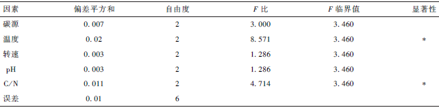 由表2 可以看出,菌株YN3 脫氮的最優條件為A3B2C3D2E2,即,碳源為檸檬酸鈉,30 ℃ ,200 r·min - 1 ,pH = 7,C / N = 15 時。通過極差分析法,分析5 種因素對菌株YN3 硝化性能的影響順序,依次為溫度> C / N > 碳源> pH > 轉速。由表3 方差分析得到,影響因子溫度和C / N 對菌株YN3 的脫氮效率影響顯著,同時,F 比值越大,因子的影響越顯著,其結果與方差分析結果一致。說明菌株YN3 對溫度的敏感度最大。C / N 比、碳源影響次之,充足的碳源才能保證菌株YN3 的生長以及異養硝化的有效進行,但C / N過高時,會使有機物嵌入酶結構,影響酶活性從而抑制反應。碳源的結構影響菌株YN3 對其吸收的效率,從而影響菌株YN3 的生長以及反應的有效進行,pH 和轉速的影響最小,說明菌株YN3 對pH 和轉速的適應范圍比較廣。