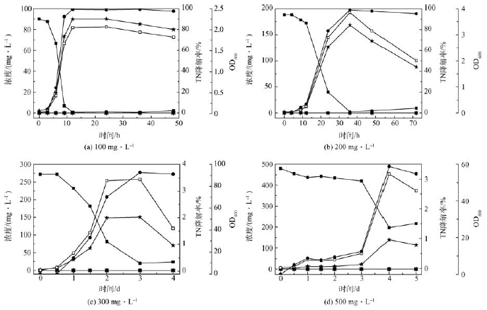 菌體生長狀態(OD600 )采用吸光度法測定;NH4+ -N 濃度采用納氏試劑分光光度法;NO3- -N 濃度采用紫外分光光度法(HZ-HJ-SZ-0138);NO2- -N 濃度采用N-(1-萘基)-乙二胺光度法(GB 7493-87);細胞內氮的含量采用凱氏定氮法(GB 11891-89),繪制菌體密度和含氮量的關系圖 ;NH2OH-N 濃度采用間接分光光度法 ;TN 濃度為NH4+ -N、NO3- -N、NO2- -N 和NH2OH-N 濃度之和。
