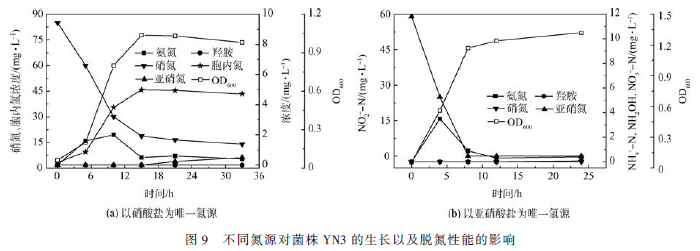 4)菌株YN3 還能夠利用亞硝酸鹽和硝酸鹽進行生長代謝,去除率分別為100% 和83. 5% 。