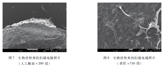 圖6是新活性炭,可明顯觀察到此時活性炭含有大量微孔結構和不規則表面,有巨大的比表面積,可吸附雜質及為微生物提供了適宜的附著點。由圖7可以看出,掛膜后活性炭表面附著一些微薄并顏色透明的片狀絮體,有些細菌在一定的環境條件下經正常新陳代謝作用可形成一層鉆液性物質,包圍在細胞壁外面,當細菌運動時,有一些鉆液會從細胞表面剝離開來,而有些細菌的鉆液層能與其他細菌鉆結起來,使許多的細菌出現成群生長的現象,最終形成菌膠團。菌膠團是生物膜的重要組成部分,有較強的吸附和氧化有機物的能力。圖8顯示活性炭自然表面聚集著一些短桿菌和球菌,并有少量長桿菌及妊狀體。
