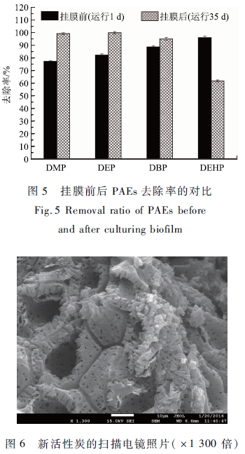 由圖4可知,運行開始(1 d),生物膜尚未形成,活性炭濾池對DMP,DEP,DBP和DEHP的去除率為77. 41 % ,82. 40% ,88. 87%和96. 17 %,說明活性炭濾池的吸附、截留作用對4種PAEs有良好去除效果,去除率大小為DEHP > DBP > DEP > DMP。隨著生物膜的逐漸形成,DEP和DMP的去除率平穩上升,在13 d達到峰值,去除率穩定在98%左右;;DBP和DEHP的去除率變化波動較大,在運行30 d,生物膜形成后,DBP和DEHP的去除率分別穩定在95%和79%左右。由圖5可知,運行35 d后,生物活性炭濾池對4種PAEs的去除率分別為99. 3% ,100% ,95. 27%和61. 9%,比起運行初期,DMP,DEP和DBP的去除率分別提高了約21. 89 % ,17. 60%和6. 40%,而DEHP的去除率降低了34. 26%,說明掛膜后,活性炭表面生長的微生物增強了濾池對DMP,DEP和DBP的去除效果,卻降低了濾池對DEHP的去除效果。分析原因可能是掛膜后濾池的生物降解所發揮的作用大于活性炭吸附作用,而PAEs的的生物降解速率與其分子量及結構相關,4種PAEs的分子量大小及烷基鏈長短的順序是DMP < DEP < DBP