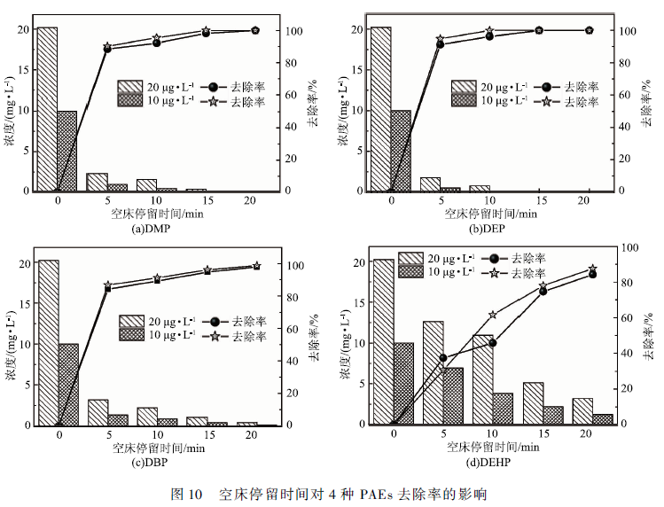 掛膜成功后,分別調節生物活性炭濾池的以下3個運行條件,考察其對濾池降解4種PAEs的影響,結果以多次平行測試實驗的標準偏差<5%為準:
