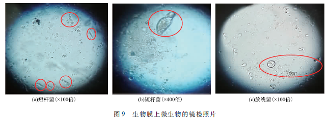 使用光學顯微鏡觀察活性炭表層附著的生物膜。發現生物膜上有較多短桿菌和少量放線菌,圖9是短桿菌與放線菌的鏡檢照片。