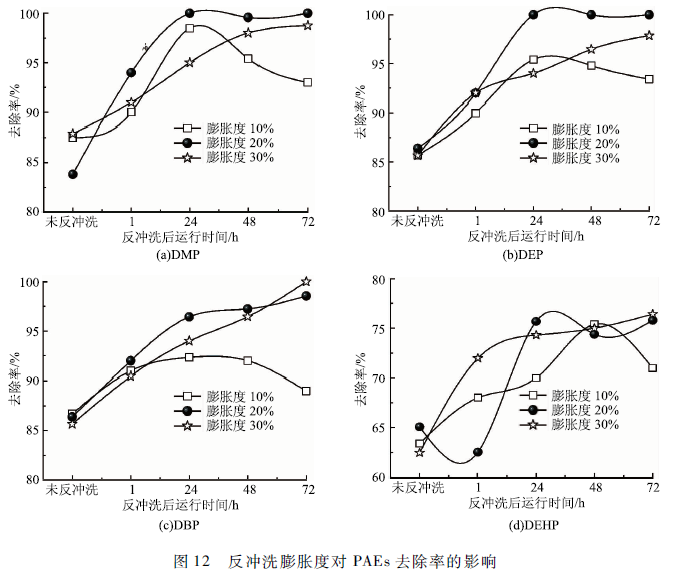 在運行期間,隨著炭床上污染雜質、微生物及其分泌物的逐漸累積,活性炭孔隙空間逐漸被填充以致堵塞,增加濾池的水頭損失,加之生物膜的老化,細胞的消亡或分解,不僅降低濾池對污染物的降解性能,而且還可能對出水水質產生污染,此時必須進行反沖洗。反沖洗強度不夠,活性炭吸附的雜質沒有洗凈,表面附著的生物量沒有得到更新,生物膜會加快生長、不斷增厚,加速濾料的堵塞;反沖洗強度過高,生物量又會被高強度沖刷而大量隨水流失,濾池的運行效果受到明顯影響,所以選擇合適的反沖洗強度(膨脹度)顯得尤為重要。設置反沖洗時濾池的膨脹度在10% ,20%和30% 3個梯度,觀察4種PAEs在反沖洗后的去除率變化情況,結果如圖12所示。