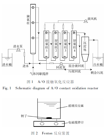 本實驗截取A2/O工藝的生物脫氮單兀,即A/O部分對皮革廢水厭氧出水進行處理,其中好氧段采用接觸氧化工藝,重點探討各主要運行工況參數對COD,氨氮以及TN的處理效果影響,從而得出提高皮革廢水生化處理效果的運行工況和措施。針對生化出水COD難以達標的情況,采用Fenton工藝對其進行深度處理,討論能使最終出水COD達到廣東省《水污染排放限值》(DB 44/26-2001 )第2時段一級標準的Fenton運行條件。