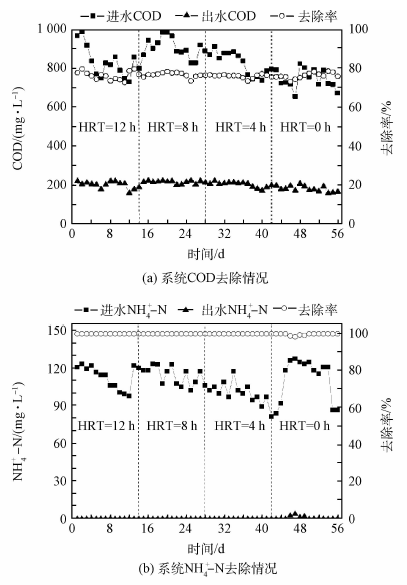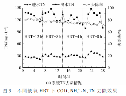 反硝化是生物脫氮必不可少的環節,良好的反硝化效果不僅可以及時的將系統硝化過程中產生的亞硝酸鹽和硝酸鹽還原成氣態氮,實現氮素的最終去除,同時還可以為硝化反應補充堿度,促進硝化反應的進行。系統掛膜啟動成功后,維持好氧HRT =24 h,混合液回流比為200 %,好氧柱DO為2. 5一3. 5 mg / L,考察缺氧H RT分別為12,8,4和0h時系統的COD,氨氮以及TN的去除情況,其中缺氧HRT = 0 h時,混合液由原來的回流至缺氧柱改為回流至圖1中的好氧柱1,回流比仍為200 %,實驗結果如圖3所示。