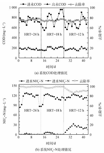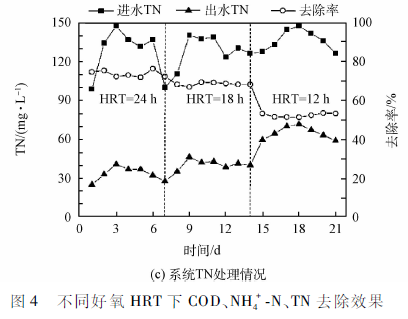 本階段實驗取消缺氧段,好氧柱DO為2.5 -3.5 mg / L,混合液由好氧柱4回流至最前端好氧柱,回流比仍為200 %,通過調整好氧柱的個數改變好氧HRT,分別考察好氧HRT為24、18、12 h時系統的COD,氨氮和TN的處理效果,實驗結果見圖4。