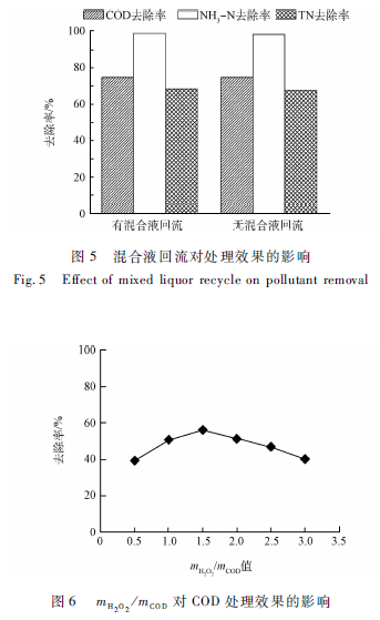 在傳統的A/O工藝中,好氧段一般為活性污泥法,缺氧段位于好氧段的前端,為了達到較好的反硝化效果,需要將經過硝化反應的混合液回流至缺氧段,以保證硝化反應產生的硝酸鹽和亞硝酸鹽被充分還原。通常的混合液回流比為200%一400 %。但是由前面的實驗結果分析可知,好氧接觸氧化反應器中的SND具有良好的脫氮效果,因此取消了缺氧段,此時混合液由圖1中的好氧柱4回流至好氧柱1是為了增大硝酸鹽以及亞硝酸鹽的反硝化時間,防止好氧柱中反硝化效率過低導致脫氮不徹底。本階段固定好氧HRT = 18 h,好氧柱DO為2. 5一3. 5 mg / L,通過對比有無混合液回流的處理效果來考察好氧柱中反硝化效率,判斷此時的內回流對脫氮效果是否有影響,實驗結果見圖5。