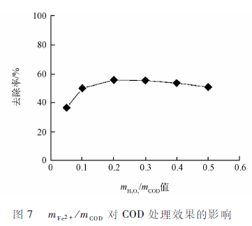 如圖7所示,前期mFe2+ / mCOD值較小時,COD的去除率隨著比值增加而迅速增大,當mFe2+ / mCOD =0. 2時,去除率達到最大值56. 07%,繼續增大mFe2+ / mCOD 的值,去除率有略微的下降。分析其原因可能是過量的Fe2+導致H2O2分解速度過快,產生的經基自由基過多,使得經基自由基之間發生了自由基反應,降低了經基自由基的利用率。因此mFe2+ / mCOD =0.2時處理效果最佳。