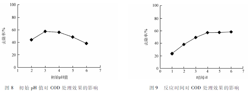 pH是Fenton反應的重要影響因素,pH過高會抑制經基自由基的產生,同時會導致Fe2+過早沉淀,無法發揮催化作用。而pH過低又會阻礙Fe3+被還原為Fe2+,同樣不利于Fenton反應。由圖8可知,在生化出水COD = 220 mg / L , mH2O2 / mCOD = 1. 5 ,mFe2+ / mCOD = 0. 2,反應時間t=5 h的條件下,當pH為3時,COD的去除率最高,為57. 44%,過高或過低都會使去除率降低。