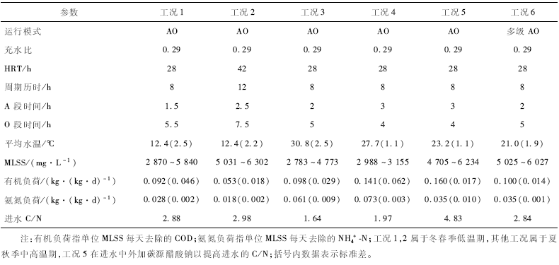 各工況的進水NH3-N濃度平均值分別為142. 1 ,191. 4,241. 9,257. 2,219. 0,236. 7 mg / L,出水NH3-N濃度平均值分別為53.6,14.0,58.7,47.7,8.3,5.6 mg / L,NH3-N去除率平均值分別為62.3 %、92.6% ,75.7% ,81.5% ,96.3% ,97.7%。可見,春冬季低溫條件下,出水NH3-N若要達到一級排放標準,H RT需達到42 h。夏季高溫期(工況3 ,4)進水NH3-N的濃度超過200 mg / L,出水均未達到二級排放標準,且出水pH分別低至5. 81 ,5. 90,說明過低的pH已嚴重影響生物硝化效率。分析其原因在于:1)黑水自身堿度不足,無法實現氨氮完全硝化;2)黑水的C/N,B/C較低,可用于反硝化的易降解COD偏低,導致反硝化效果不佳,因此提供的反硝化堿度不足。工況5外加碳源后,出水的氨氮濃度達到一級A排放標準;工況6采用多級AO分時進水的運行模式,最大程度地利用了進水的碳源和堿度,出水氨氮同樣達到一級A排放標準。