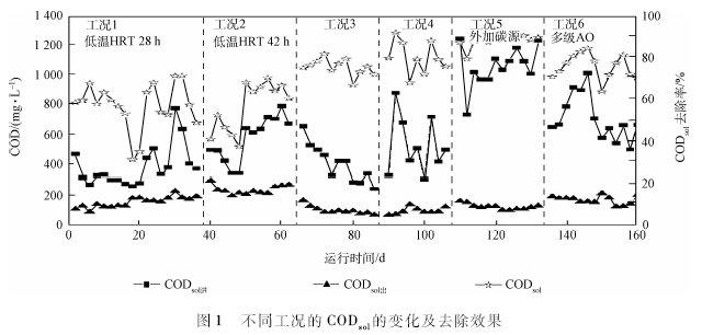 如圖1所示,6個工況的進水CODsol平均值分別為393 ,593 ,406,530,1 058和711 mg / L,出水CODsol平均值分別為158,238,98,95,123和168 mg / L ,平均去除率分別為57.3% ,57.2% ,75.2%、79.9% ,88. 1%和75.6% 。HRT均為28 h的條件下,冬季低溫時出水的CODsol平均達到158 mg / L,平均去除率僅有57.3 %;夏季出水CODsol可降低到95 mg / L ,平均去除率為79.9%。從各工況的出水CODsol濃度看,均難以達到一級排放標準。田海濤等指出,SBR處理經水解酸化預處理后的糞便廢水,出水仍殘留部分難降解COD,不能滿足排放要求。孫倩發現,糞便污水經厭氧、好氧工藝處理后,出水中殘留的難降解有機物的COD為250一 400 mg / L,而BOD5僅30 mg / L左右。HOCAOCLU等對黑水中的有機物分子質量分布、成分、生物降解性等分析結果表明,有68. 4%的COD是顆粒態,可生物降解COD占95. 1 %,其中易生物降解的COD僅占14. 7%,而溶解性惰性COD占3. 7%,顆粒狀惰性COD占1. 1% 。從表1可以看到,黑水的COD.達到1 627 mg / L,推算惰性溶解態COD為60.2 mg / L,再加上難降解COD的比例,單純采用SBR處理,出水很難達到一級標準(不超過60 mg / L)。至于黑水與灰水和廚房廢水混合所組成的生活污水經過生化處理后COD可降低到40 mg / L左右或更低,主要是因為黑水僅占生活污水的30%左右,其難降解有機物被稀釋;此外,灰水和廚房廢水的易降解有機物多,微生物可利用這部分有機物通過共代謝等方式去除一部分黑水的難降解成分。