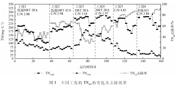 歸納前5個工況的運行結果及本團隊研究的其他工況的實驗結果,可以得到以下統計結果,采用單級AO-SBR處理黑水,無論低溫還是中溫,水力停留時間合適時,即低溫HRT達到42 h,中溫HRT達到21 h,當進水的C/N為1. 5一2. 0時,TN去除率為40%一50%;進水的C/N為2. 0一3.O,TN去除率在60%一70 %;當進水的C/N提高到4. 0一5. 0時,TN去除率可達到80%以上。