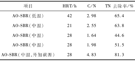 反硝化脫氮需要碳源,C/N是一個影響脫氮率很重要的參數。理論上,完全反硝化脫氮所需要的C/N比(BOD5 / N03 -N)為2. 86,實際上生物脫氮系統所需的C/N要大于2. 86,如果以COD/N03 -N來計算,則遠大于2. 86。從本實驗結果來看,黑水采用單級AO-SBR處理,夏季HRT為28 h時,C/N分別為1. 64,1.98 ,TN去除率僅有44. 6%和51.5%;同樣工況條件下,外加碳源至C/N為4. 83 , TN去除率提高到81.3%。單級AO-SBR在冬季低溫條件下H RT提高到42 h,C/N為2. 98時,TN去除率為65.4%。