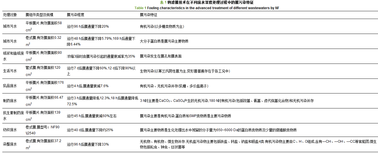 2 納濾膜技術在廢水深度處理中的膜污染研究現狀(Fouling of nanofiltration membrane in the advanced treatment of wastewater) 2.1 納濾膜技術在廢水深度處理中的膜污染特征