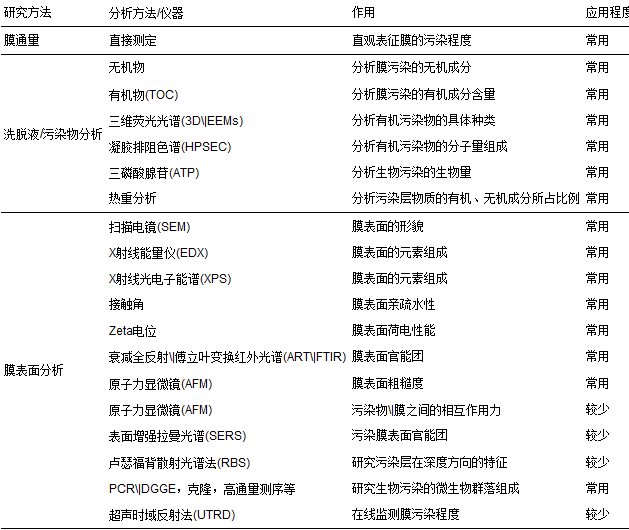 目前對納濾膜污染的分析方法主要分為3大類,分別是以通量下降直觀表征膜污染程度、以洗脫液成份分析或污染層物質分析判斷膜污染物的成份及含量、以污染膜表面表征分析例如SEM、AFM、ART\|FTIR等從微觀角度探索膜污染的特征及形成機理(Zazouli et al., 2010).具體分析方法及作用如表 3所示.