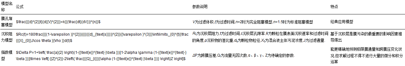膜污染的數學模型可以分為3種:1是從膜的結構、特征出發描述污染現象的模型,如膜孔堵塞模型、沉積層阻力模型等;2是指數經驗模型;3是計算機軟件開發模型,如神經網絡模型和計算流體力學模型等(陳安穩等,2012).常用膜污染模型如表 4所示.