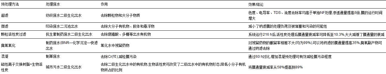 如前所述,進水水質與膜污染有著密切關系.在納濾膜處理廢水過程中,采取有效的進水預處理方法可以減緩膜污染,延長膜的使用周期.文獻中常用的進水預處理方法及效果如表 5所示.