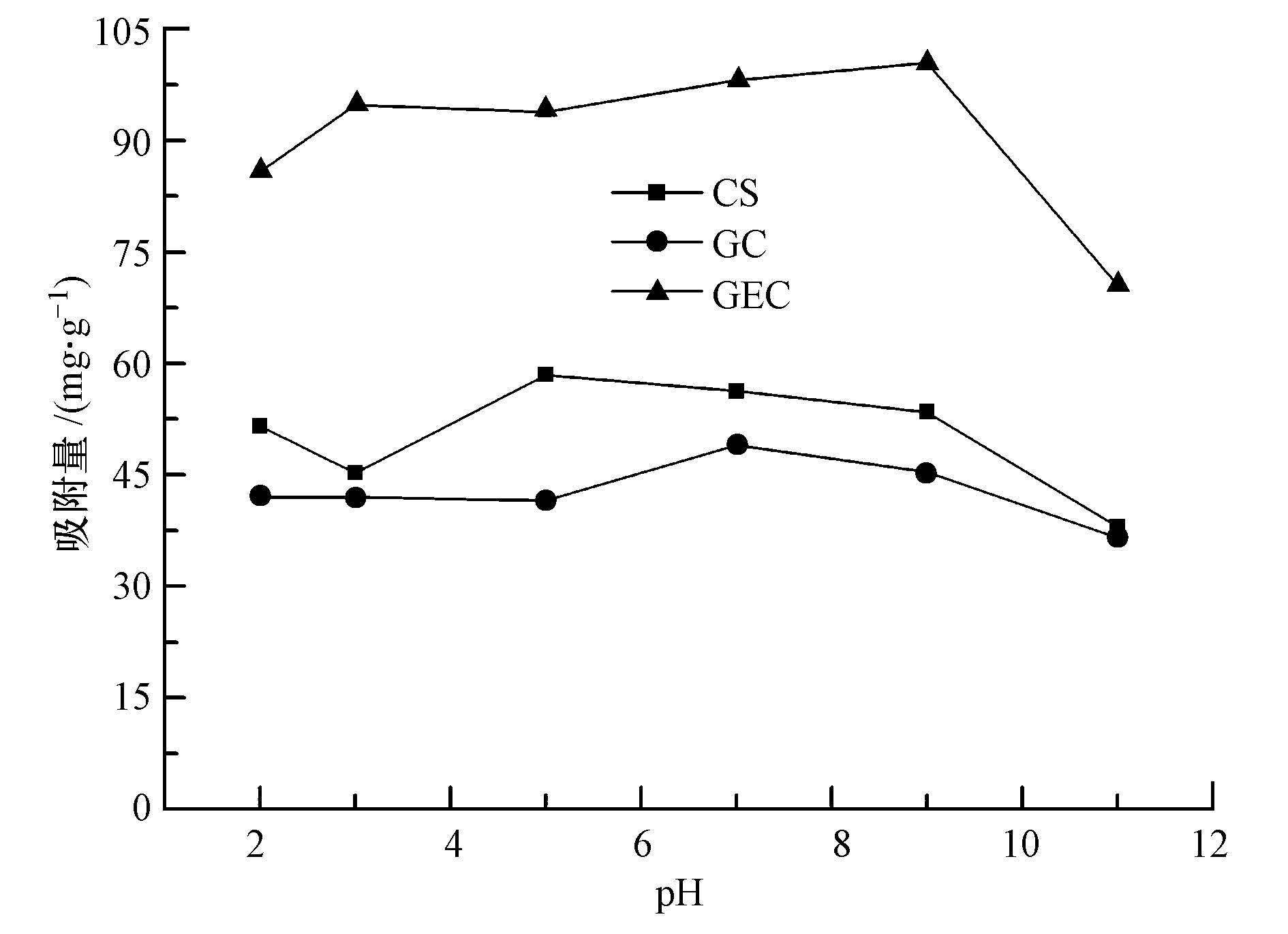在不同初始pH值條件下吸附劑對CR吸附效果的影響如圖 6所示.可以看出,GEC、GC和CS 在不同pH值時的吸附量也不同,這主要是因為溶液的pH值會影響吸附劑及污染物表面的電荷分布,從而影響吸附劑與污染物之間的靜電吸引力,但總體變化幅度不大,說明靜電作用在此吸附過程中的貢獻不是很大,起主要作用的可能是氫鍵等其他作用.與此同時可以看出,GEC在相同pH條件下的吸附量遠遠高于GC和CS,說明對GC的改性具有明顯的效果.