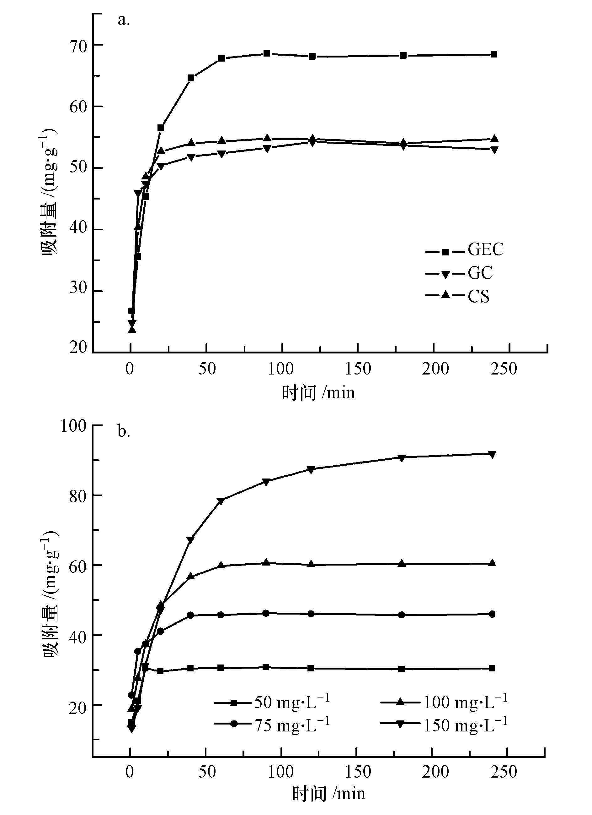 圖 8a為3種吸附劑在不同反應時間對CR的吸附效果.可以看出,隨著反應時間的增長,GEC、GC和CS對CR的吸附量均在增加,并在100 min左右達到平衡,在吸附平衡處GEC的吸附量明顯比GC和CS高.圖 8b展示了在不同CR溶液初始濃度條件下,反應時間對GEC吸附效果的影響.可以看出,在不同CR溶液初始濃度條件下,隨著反應時間的增長,GEC吸附效果呈現的趨勢相似,剛開始隨著時間的增長,吸附量逐漸增加,這是由于反應初期吸附劑逐漸與CR接觸,吸附量逐漸增加,但溶液中的吸附劑達到吸附飽和狀態或者溶液中CR已基本去除后,隨著時間的增長,吸附量已不再變化,即達到所謂的平衡狀態.本實驗中,GEC對CR的吸附在100 min左右即達到平衡,此時去除率接近100%,吸附量達到91.89 mg·g-1.