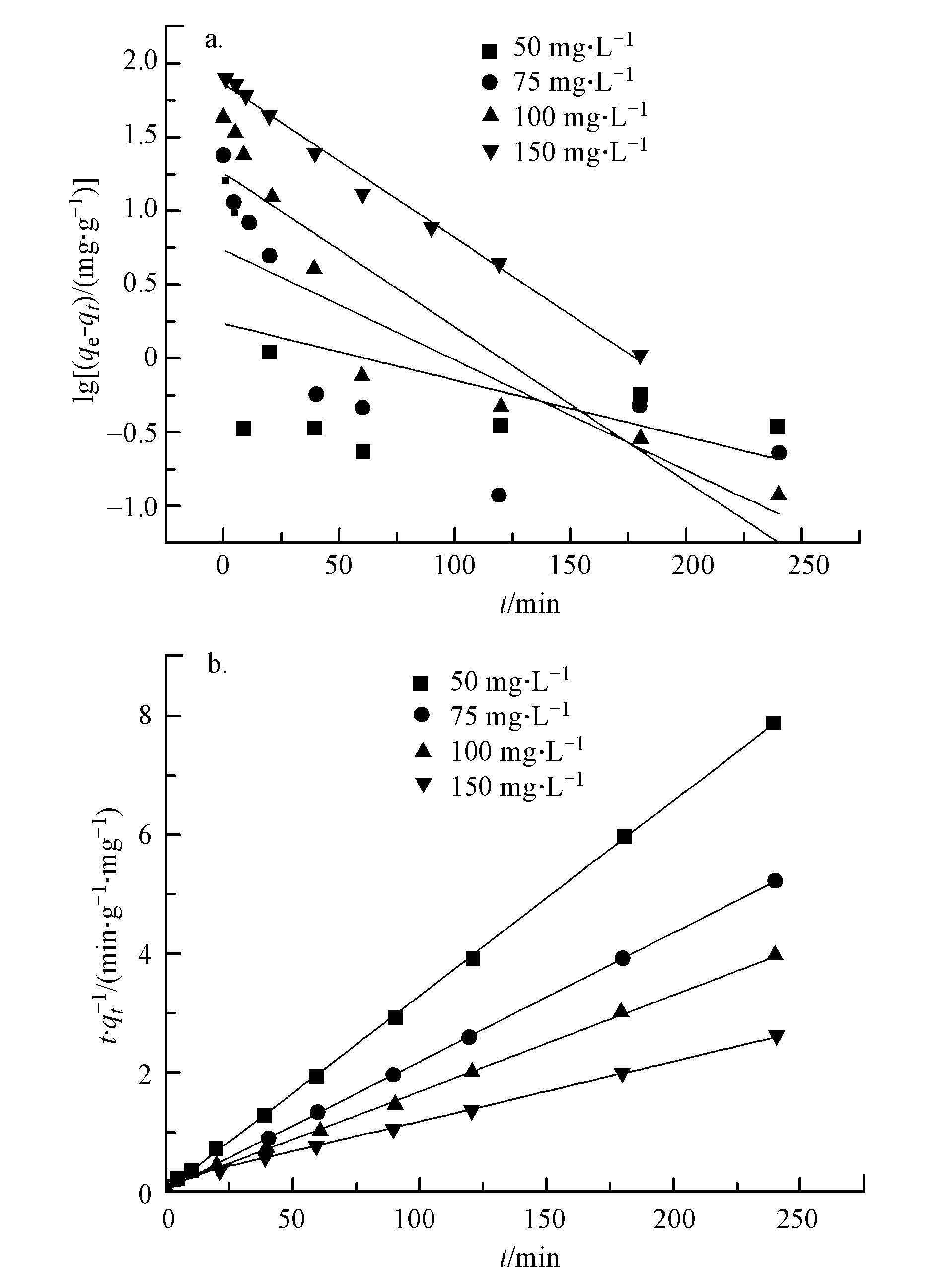 式中,qe和qt分別為吸附平衡時及t時對CR的吸附量(mg·g-1),k1為偽一級動力學方程的速率常數(min-1),k2為偽二級動力學方程的速率常數(g·mg-1·min-1).以lg(qe-qt)對t作直線,通過該直線的斜率和截距可分別得到k1和qe的值.以t/qt對t作直線,通過該直線的斜率和截距可分別得到qe和k2的值.