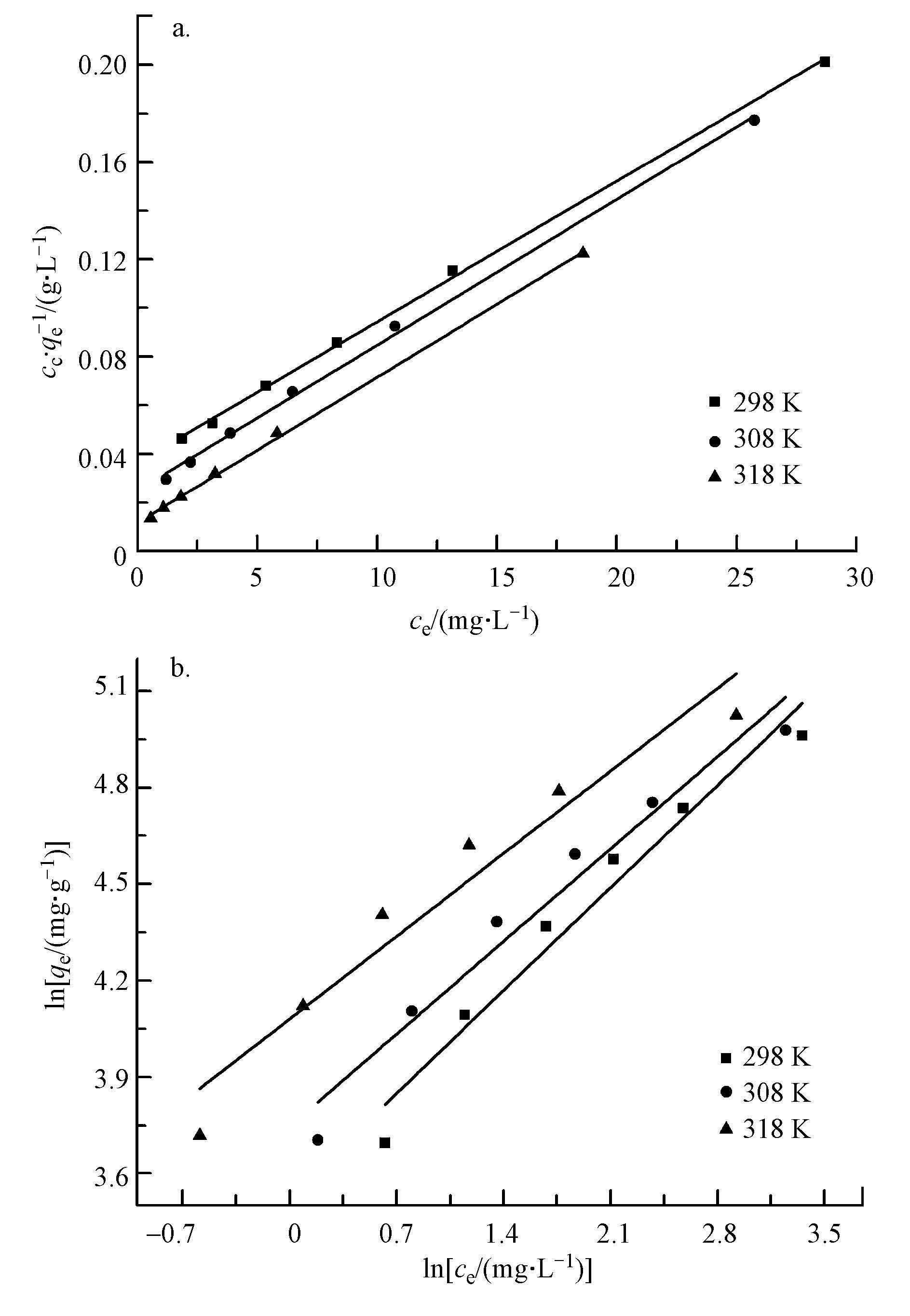 式中,qm為最大吸附量(mg·g-1),ce是吸附平衡時溶液中吸附質的剩余濃度(mg·L-1),qe是吸附平衡時吸附劑對吸附質的吸附量(mg·g-1),kL是與吸附性能有關的平衡常數(L·mg-1).以ce/qe對ce作直線,由該直線的斜率和截距可得qm與kL的值.在這里可定義一個無量綱分離系數RL: