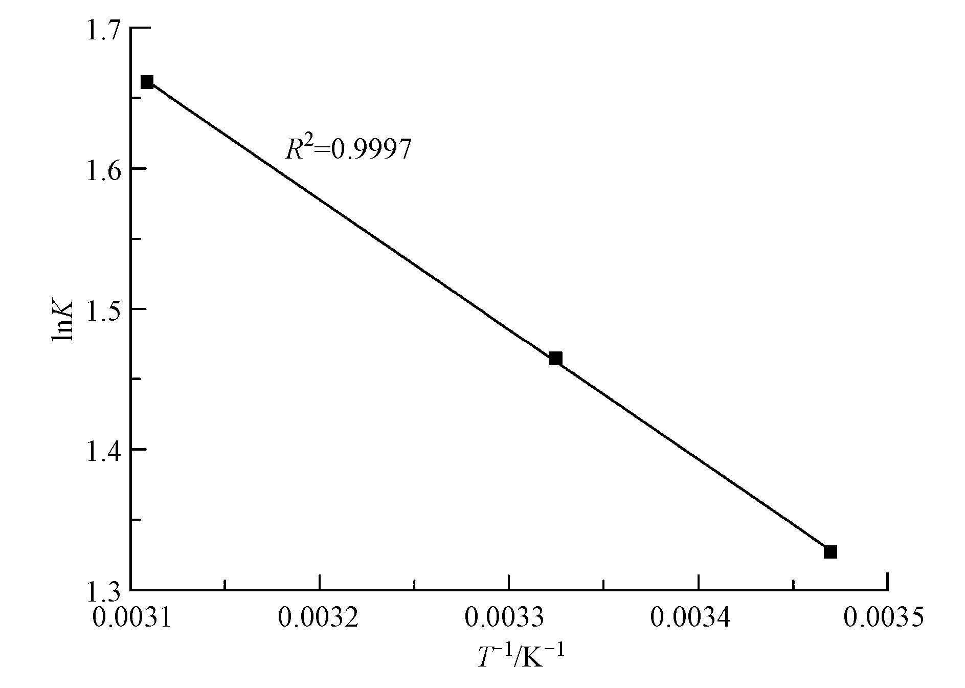 式中,c0(mg·L-1)是溶液中溶質的最大初始濃度.根據RL的值可將吸附等溫線分為非優惠吸附(RL>1)、線性吸附(RL=1)、優惠吸附(0 Freundlich模型適用于發生在不均一吸附劑表面的非理想吸附,屬于經驗方程式,其線性形式為: 式中,1/n為無量綱的系數,該系數與吸附強度有關;kF為Freundlich吸附平衡常數.以lnqe對lnce作直線,通過該直線的斜率和截距可得1/n和kF的值. 圖 10 GEC吸附剛果紅的Langmuir吸附等溫線(a)和Freundlich等溫線(b)擬合 應用上述兩種吸附等溫線對實驗數據進行擬合,所得結果如圖 10和表 2所示.由表 2的擬合參數可知,Langmuir 吸附等溫模型能更好地描述GEC對CR的吸附過程.通過Langmuir吸附等溫方程式擬合可知,GEC在不同溫度條件下對CR的最大吸附容量分別為175.43 mg·g-1(298 K)、169.4 mg·g-1(308 K)和169.50 mg·g-1(318 K).此外,參數RL都符合0 表 2 GEC吸附CR的吸附等溫線參數 表 3中列出了本研究和近幾年已經報道過的吸附劑對剛果紅的最大吸附量.從表中可以看出,本研究中制備的吸附劑GEC對剛果紅的最大吸附量比其他許多吸附劑的最大吸附量高,說明GEC適合作為一種吸附劑去除水中剛果紅. 表 3 GEC與其他吸附劑性能的比較 3.2.7 吸附熱力學分析 對吸附熱力學的研究可以考察吸附過程的吉布斯自由能變化(ΔG)、熵變(ΔS)和焓變(ΔH),進而分析吸附的推動力或者判斷吸附過程是否自發進行等.熱力學參數可以通過式(7)和式(8)求出(Fan et al.,2013). 圖 11 lnK對1/T作圖 式中,R為氣體常數;T為開氏溫度(K);K為吸附過程完全平衡常數.根據式(8),以lnK對1/T作圖(圖 11),進行線性回歸分析后通過斜率和截距可分別得到ΔH和ΔS的值;ΔG的值可通過式(7)直接求出.其中,完全平衡常數K的值可通過以ln(qe/ce)對qe作直線得到,qe取值為0時的值即為K值.GEC對CR的吸附過程的熱力學參數如表 4所示. 表 4 GEC吸附CR的熱力學參數 由表 4中的熱力學參數可知,ΔH為正值,說明GEC對CR的吸附是吸熱反應,提高溫度有利于反應的進行.ΔG為負值,說明此吸附是自發過程,同時ΔG的絕對值隨著溫度的升高而增大,說明提高溫度對該吸附過程具有促進作用.ΔS為正值,說明GEC吸附CR后增加了固-液界面上物質的混亂度. 3.2.8 吸附劑再生性能研究 再生性能是評價一種吸附劑的重要指標之一,吸附劑的再生可實現多次回收利用從而降低廢水處理的成本,同時能夠回收具有利用價值的吸附質及防止飽和吸附劑里面的污染物析出而造成的二次污染.本研究利用NaOH溶液在加熱振蕩條件下對吸附飽和的GEC進行脫附處理.圖 12為同一批GEC吸附-脫附6次后每次吸附量和去除率的變化.從圖中可看出,在重復使用6次后GEC的吸附量由78.54 mg·g-1下降到73.91 mg·g-1,只下降了5.89%,這表明GEC具有良好的再生性能. 圖 12 GEC循環再生6次對剛果紅去除率和吸附量的變化影響 4 結論(Conclusions) 1) 乙二胺四乙酸二鈉改性氧化石墨烯/殼聚糖功能材料(GEC)的成功制備,不僅改善了殼聚糖在酸性溶液中的不穩定性,同時抑制了氧化石墨烯的團聚,而乙二胺四乙酸二鈉的加入為材料增加了更多的吸附基團. 2) GEC功能材料對剛果紅(CR)的吸附量比單純殼聚糖要高,且在較寬的pH值范圍內都有較高的吸附量,說明材料的改性復合明顯提高了對剛果紅的吸附能力. 3)GEC 對CR的吸附數據能夠很好地用偽二級動力學模型擬合,其吸附等溫線符合Langmuir等溫模型,此吸附過程為自發的吸熱反應.具體參見污水寶商城資料或http://m.bnynw.com更多相關技術文檔。 4) 根據Langmuir等溫模型擬合得到GEC對CR的最大吸附量分別為175.43 mg·g-1(298 K)、169.49 mg·g-1(308 K)和169.50 mg·g-1(318 K). 5) 吸附CR的GEC功能材料具有很好的再生性能,重復循環使用6次后GEC的吸附量只下降了5.89%,CR的去除率從94.25%降到88.70%.